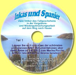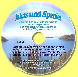 Inkas und Spanier Zwei Völker des Fallgeschehens in der Vergebens- und Wiedergutmachungsarbeit auf dem Weg nach Hause. Lassen Sie sich von einer der schönsten und spannendsten Dokumentationen über diese Reise im Juli 2012 von Claire La Belle zum Machu Picchu, Maras Moray und der Isla del Sol auf dem Titicacasee im Herzen berühren. 2 DVD´s, Teil 1: 1:40 h, Teil 2: 2:24 h, Gesamtspielzeit: 4:04 Stunden, 25,- EUR Auszüge aus diesem Film hier: kostenloser DOWNLOAD (mit rechter Maustaste anklicken und dann auf 'Ziel speichern unter...', MP4-Datei, 82 Minuten Spieldauer) |